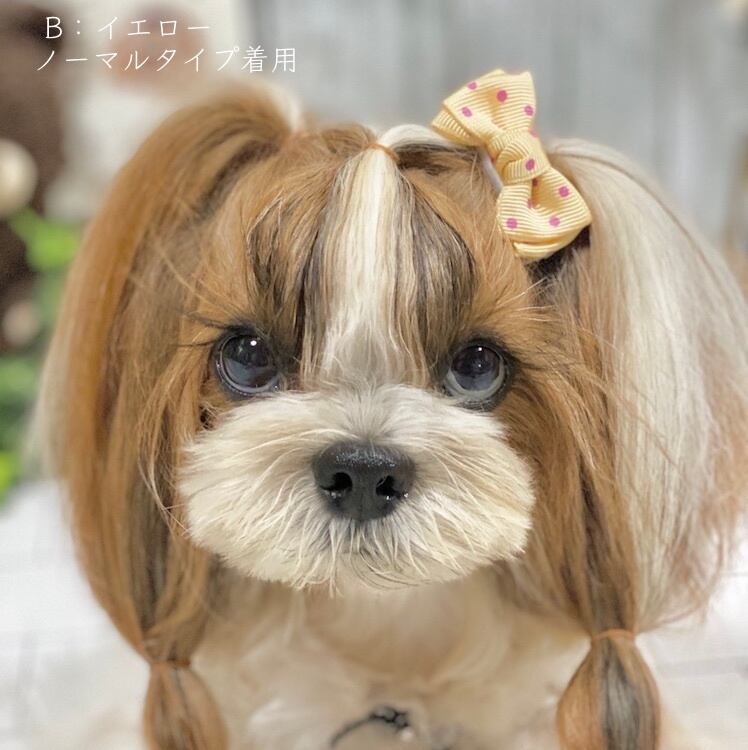 また、比較的毛量があるワンちゃんや、頭頂部だけでなく、毛の結び方を変えて耳の側、ツインテール等、色々付け方を変えて楽しみたい方、流れるデザインが好きな方。