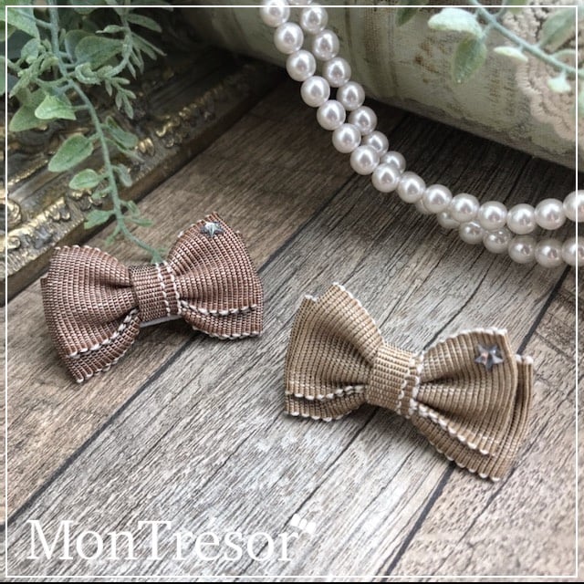 リボンと水平にバレッタを取り付けている「ノーマル」と、裏側に角度加工(約45度)がしてある「スタンド」とお選び頂けるように致しました。当ショップ独自の加工方法です。
