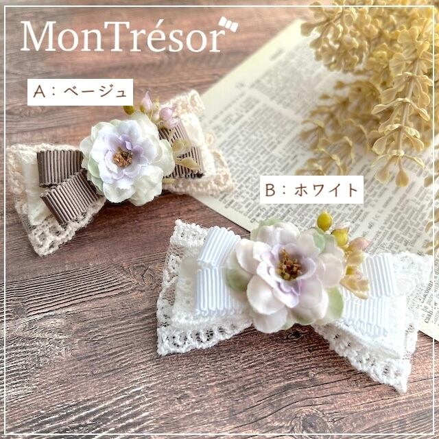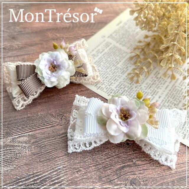 リボンと水平にバレッタを取り付けている「ノーマル」と、裏側に角度加工(約45度)がしてある「スタンド」とお選び頂けるように致しました。当ショップ独自の加工方法です。